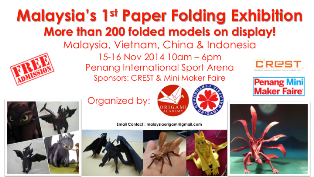 PISA (Penang International Sport Arena) in Penang is hosting the first ever Paper Folding Exhibition in Malaysia at this scale which will involve more than 200 folded models of this unique art form. The paper folding artists from China, Vietnam, Indonesia and Malaysia will be coming together to showcase their craft. Besides that, there will be a series of accompanying events that includes workshop and demonstrations to get more people involved in this art.